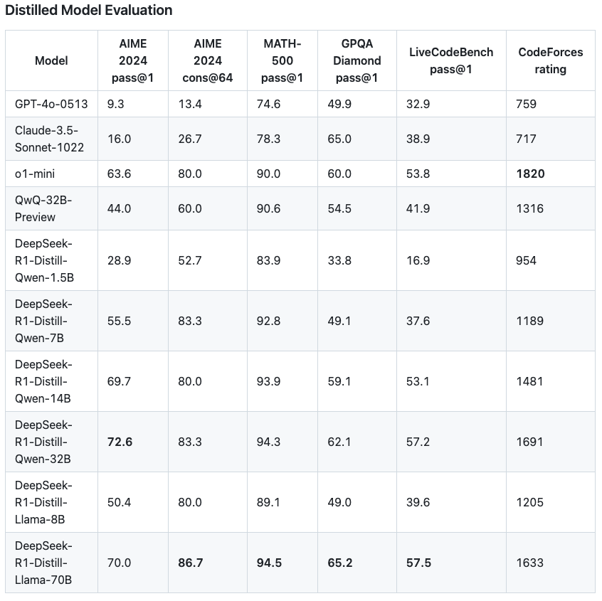 DeepSeek开源了6个用R1蒸馏的小模型,其中蒸馏版Qwen-1.5甚至能在部分任务上超过GPT-4o。