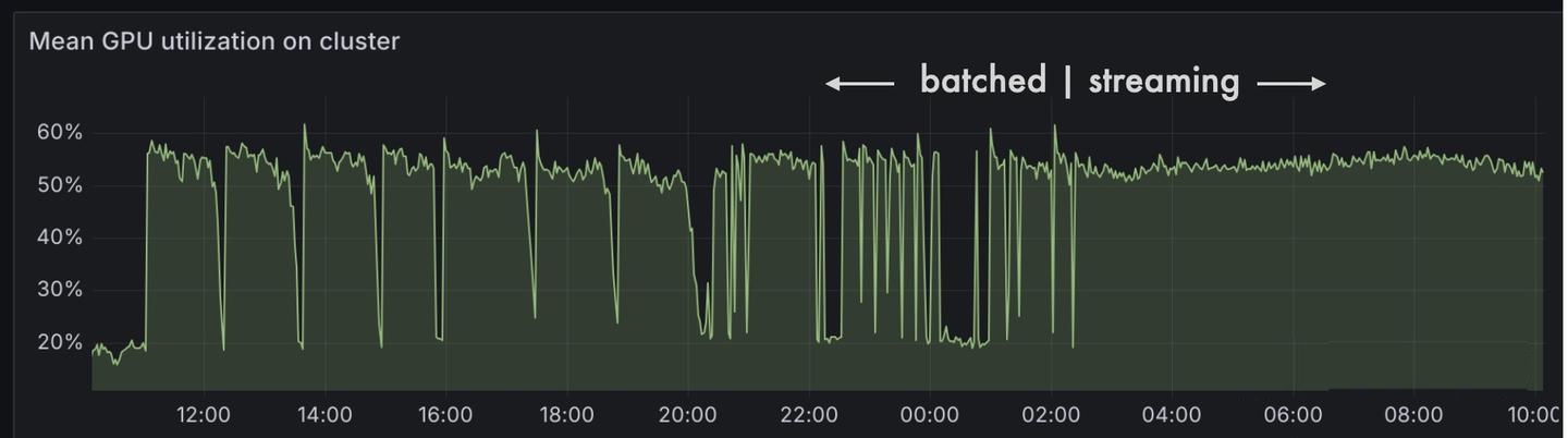 面对 R1 这类超大模型,核心挑战在于高效扩展生成规模。Open R1花费一周时间尝试了多种配置方案:该模型可部署在 2 个 8xH100 节点(16 块 H100 GPU)上,我们最初基于此配置使用 vLLM 作为推理服务器。但很快发现该方案存在性能瓶颈:由于 GPU 的 KV 缓存快速耗尽,吞吐量未达最优且仅支持 8 路并行请求。当缓存耗尽时,占用大量缓存资源的请求会被抢占;若配置为PreemptionMode.RECOMPUTE模式,这些请求将在显存释放后重新调度。为此我们切换至 4x8xH100 节点配置(共 32 块 H100 GPU)。该方案为 32 路并行请求提供了充足的显存余量,基本避免了因 100% 缓存占用导致的请求重新调度问题。初始阶段我们采用批量请求查询 vLLM 服务器,但很快发现批次中的长尾样本会导致GPU利用率波动——新批次需等待前一批次最后一个样本完成后才能开始处理。将批量推理切换为流式处理后,GPU利用率显著稳定。