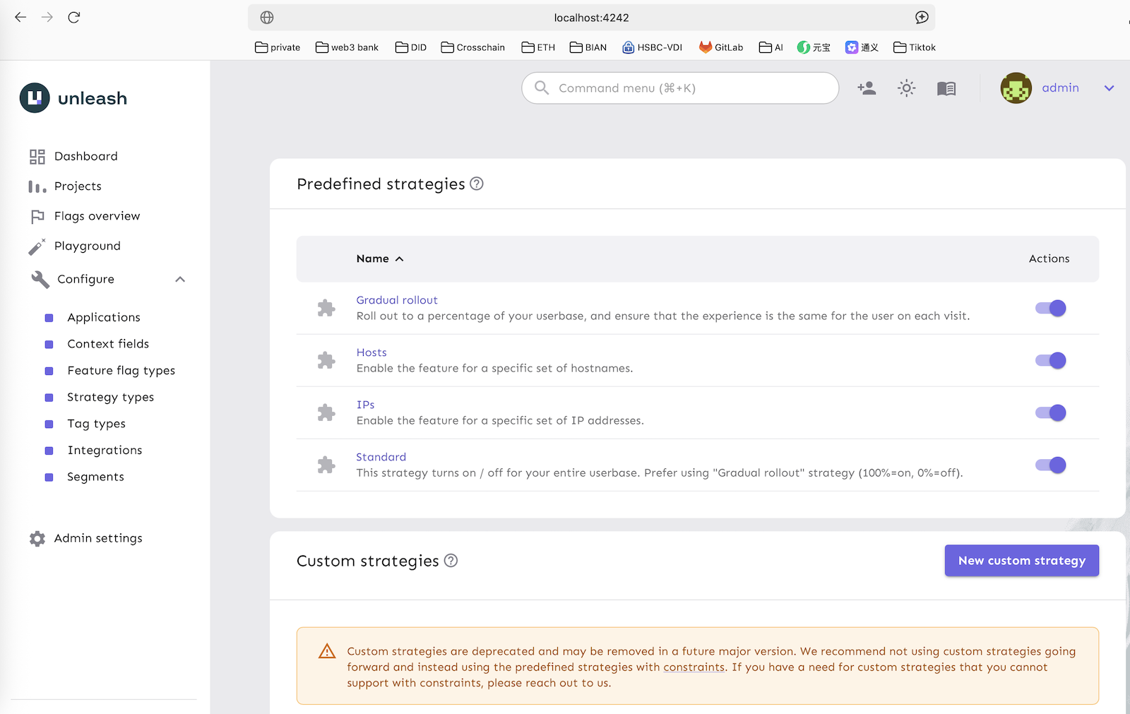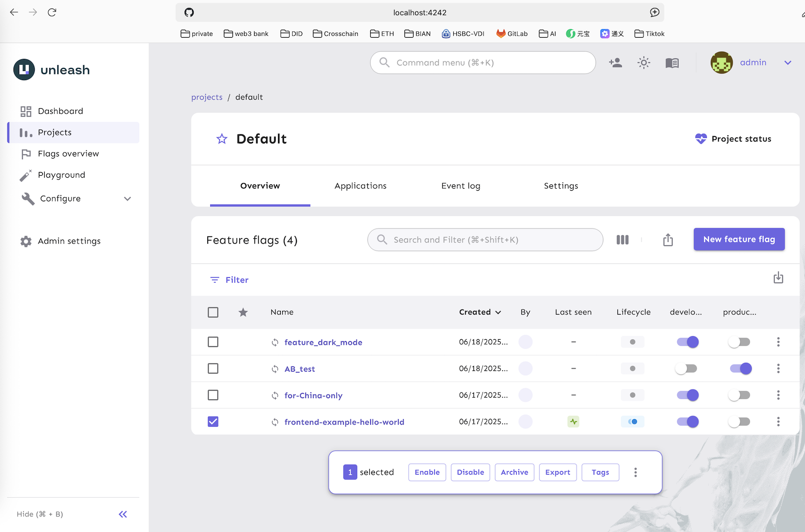 软件工程之特性管理-feature-management-day-one Posted on 2025-06-18 Edited on 2025-09-05 以 https://github.com/Unleash/unleash 为例:Here are the key concepts you’ll need when working with Unleash 架构 费用 本地运行 Demo run on local 配置 配置调整时,默认的(报文)字段 配置调整时,feature的类型 配置调整时,策略/规则 Unleash SDK支持的语言类型 项目端开发指南 Java - https://github.com/zhuang-weiming/unleash-feature-flag-sample/blob/main/docs/backend-integration-guide.md JavaScript - https://github.com/zhuang-weiming/unleash-feature-flag-sample/blob/main/docs/frontend-integration-guide.md