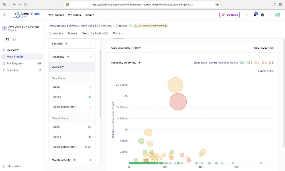 - 衡量代码中存在的Bug(错误)的数量和严重性。它是由所有类型为 Bug(错误)的 Issues 聚合计算得出的。这些Bug不一定能被外部攻击者利用,但会导致程序运行结果不正确、性能下降或直接崩溃(例如,空指针异常、资源泄漏、逻辑错误)。