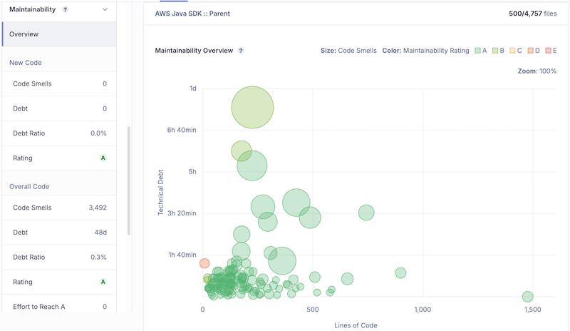 - 衡量代码的技术债和可维护性。由所有类型为 Code Smell(代码坏味道)的 Issues 聚合计算得出的。它主要关注“代码坏味道”——这些不是错误,而是设计或实现上的缺陷,会导致代码难以理解、修改和扩展(例如,过长的函数、过大的类、重复代码、复杂的条件判断)。技术债以“修复所需时间”来量化(例如,5天3小时)。