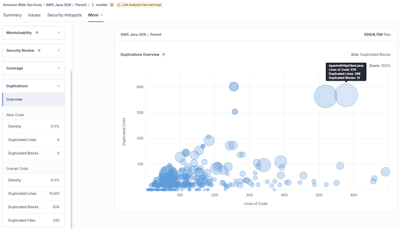 - 高重复度是代码的“坏味道”之一,意味着“复制粘贴”编程。这会导致维护困难,因为一处逻辑修改需要在多个地方进行。理想情况下,这个值应该很低。也可能是工程师为了冲高代码行数而复制出的多余代码。