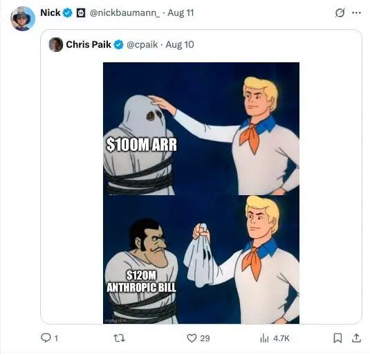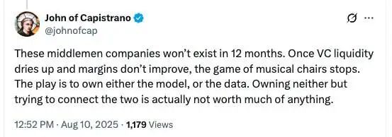 这种“推理套利”表面看是 ARR 高速增长,本质却是靠风险投资补贴在续命,说白了就是“VC 慈善”。Cline 团队甚至用梗图调侃了这种困境,甚至还有网友评论——像 Cursor 这样的中间商可能撑不过一年。