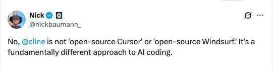 Cline 团队强调,他们不是“开源版 Cursor”或“开源版 Windsurf”,而是另一种完全不同的 AI 编码思路。Cursor 等公司依靠巨额补贴支撑的 20 美元低价订阅,并通过将请求转向更便宜的 AI 模型压低高昂成本;而 Cline “完全不玩这一套”——“我们在 AI 使用上分毫不赚,只是纯粹负责指挥推理过程。”